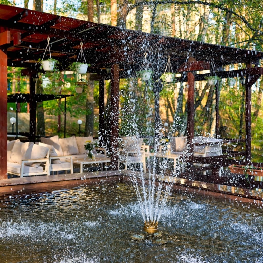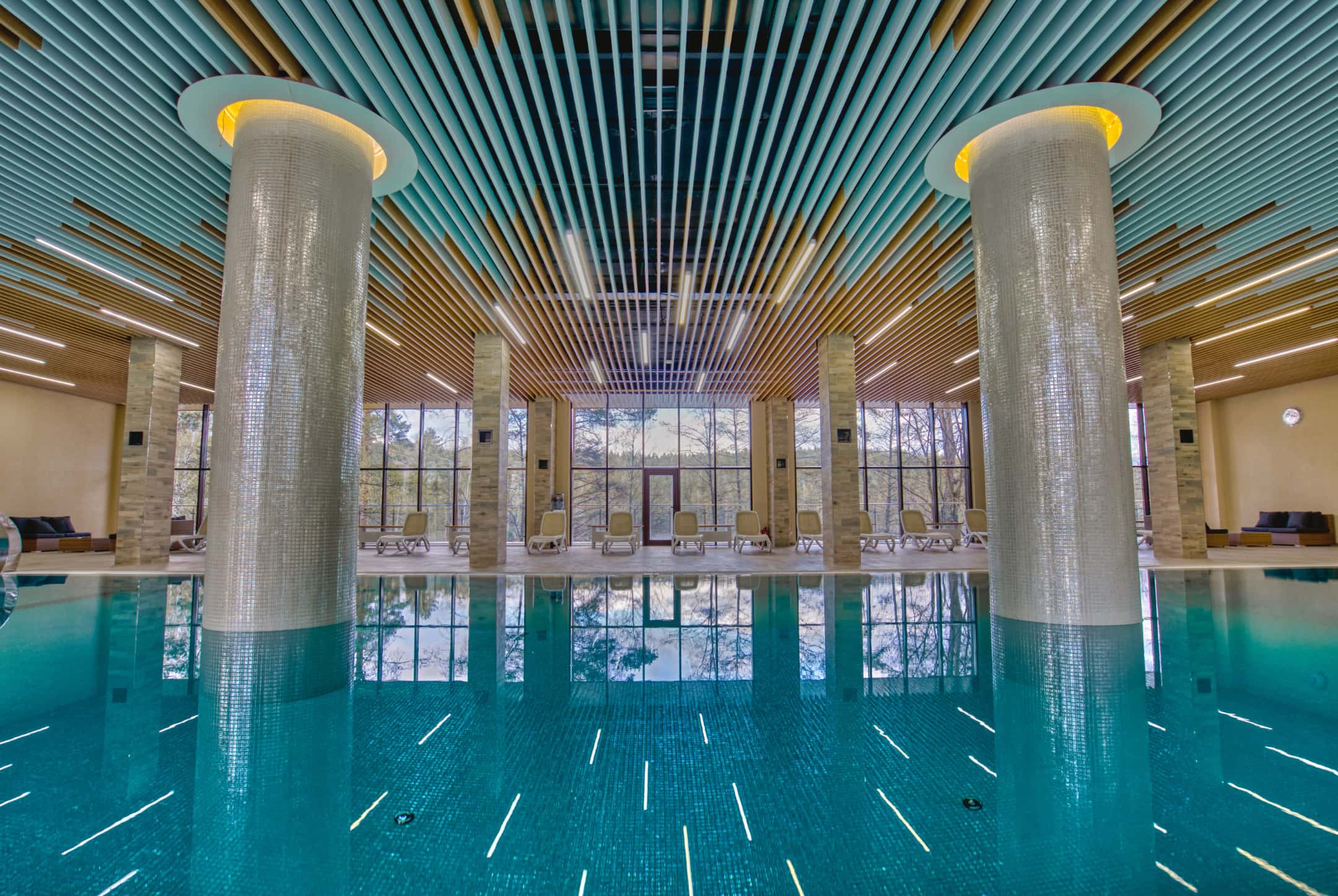 Бассейн 25 метров, с противотоками для плавания, гидромассажами, водопадами и детской секцией.