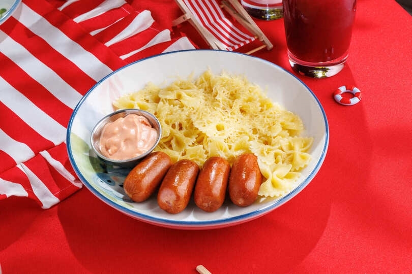 Купаты куриные, картофель стоун, квашеная капуста, соус медово-горчичный