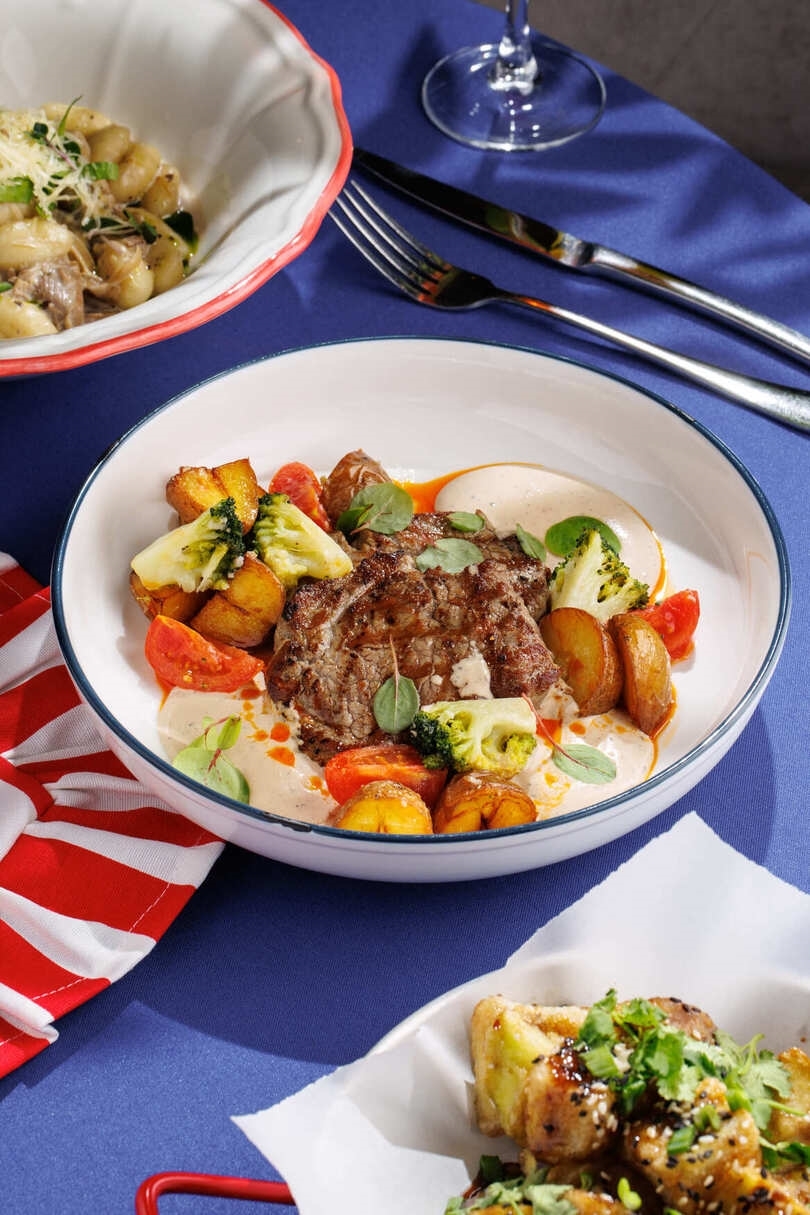 Говяжья вырезка, соус перечный, брокколи, черри, картофель мини