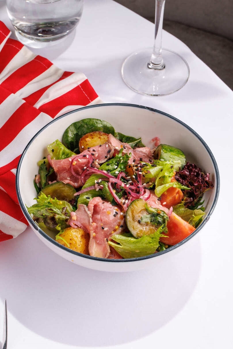 Ростбиф, микс салата, картофель бейби, лук, помидоры, огурцы, редис, медово-горчичная заправка