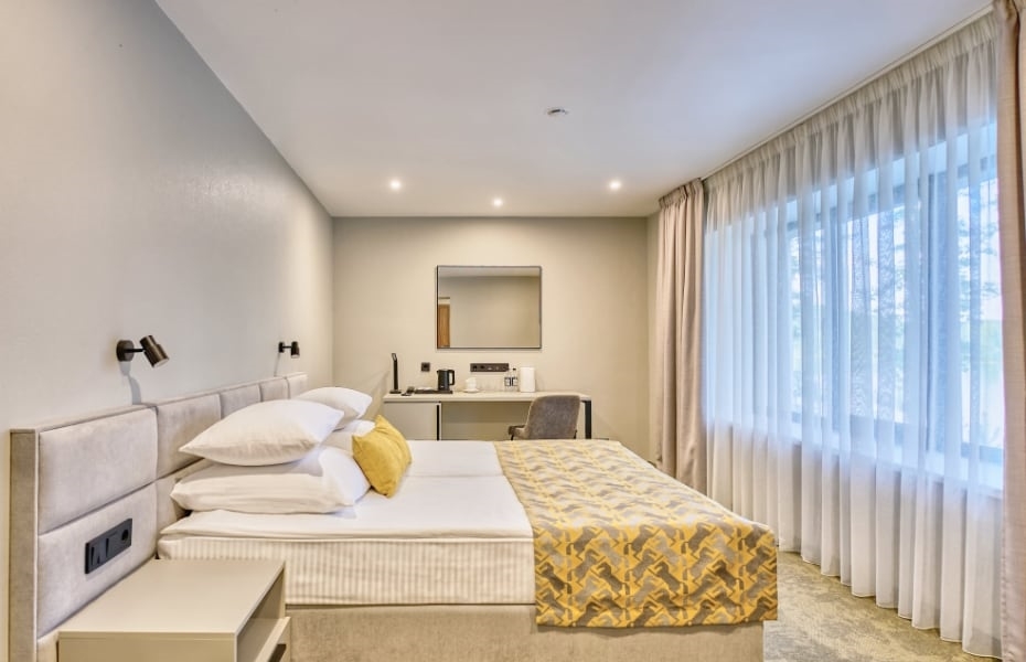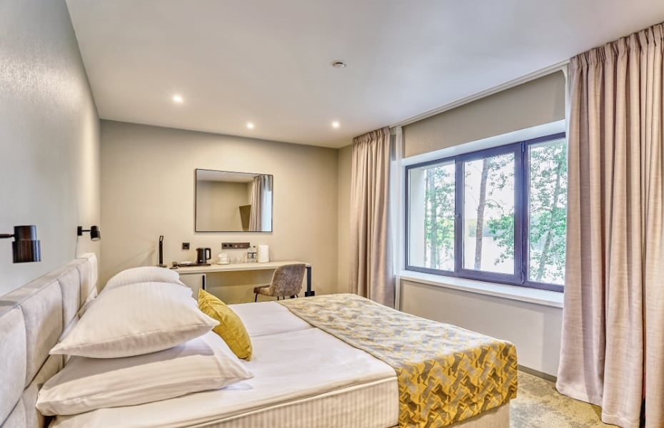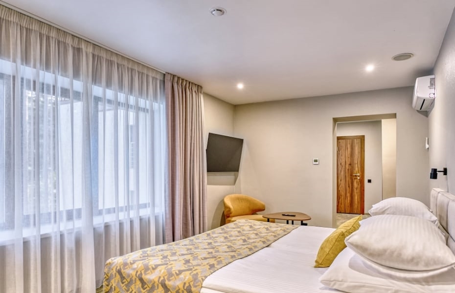 Однокомнатный номер с большой кроватью, мини-холодильником и ванной комнатой.