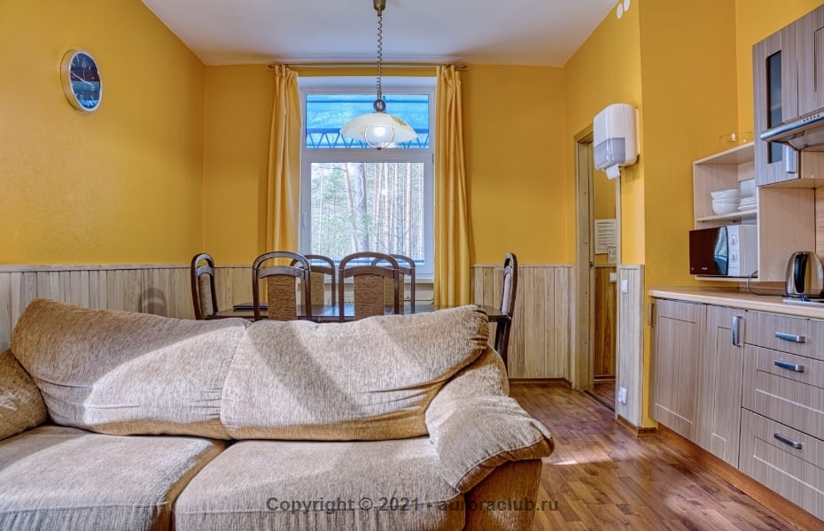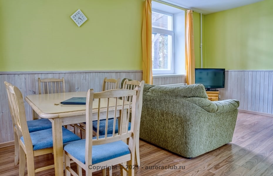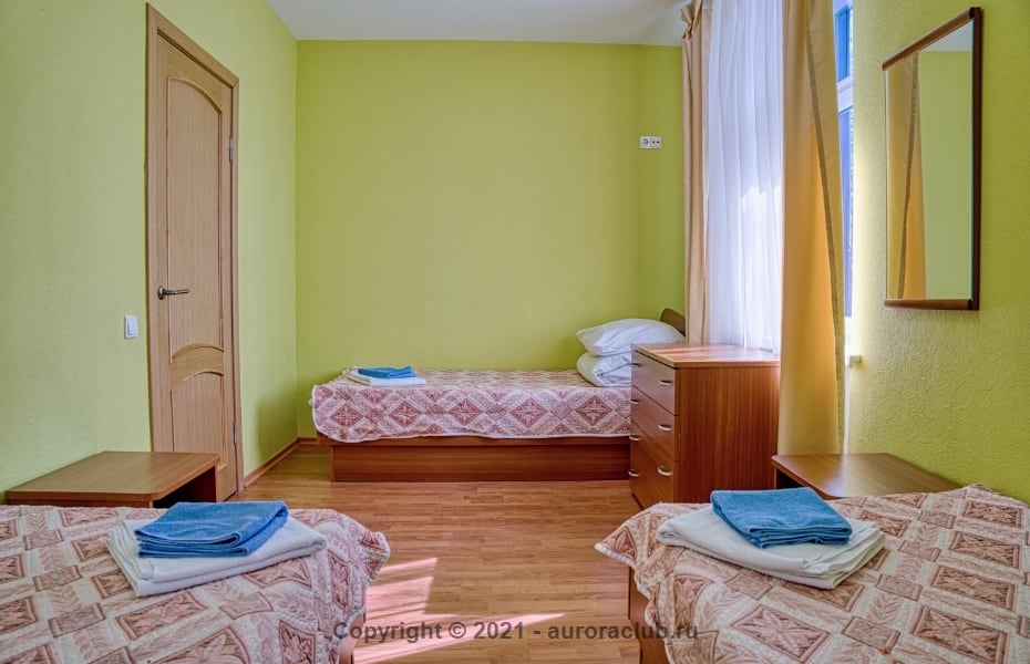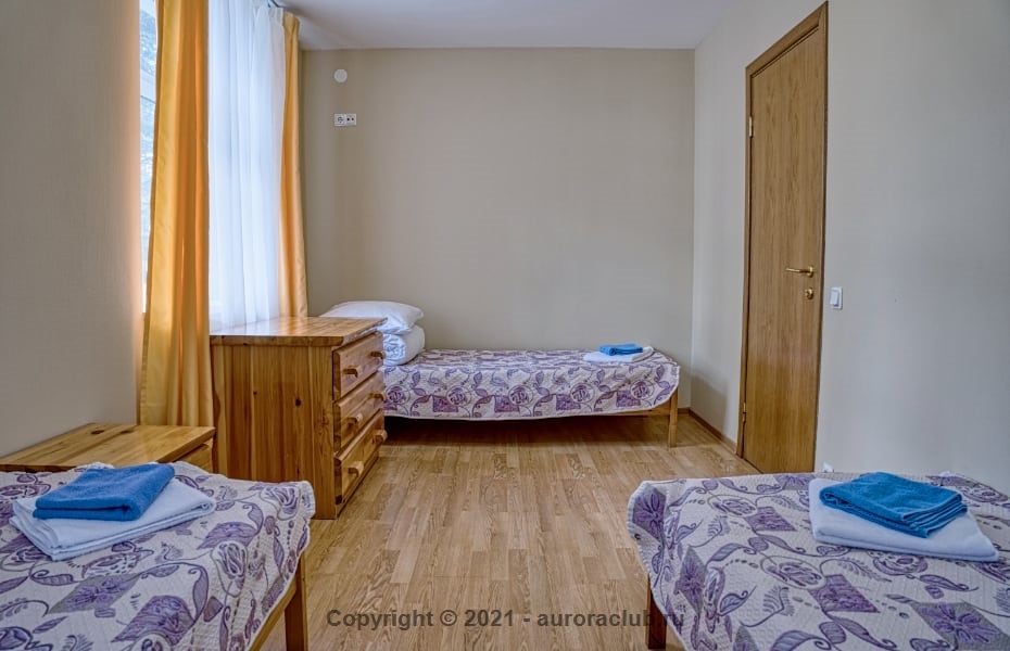 На втором этаже: Две изолированные спальни (5 полутороспальных кроватей, тумбочки, комод).