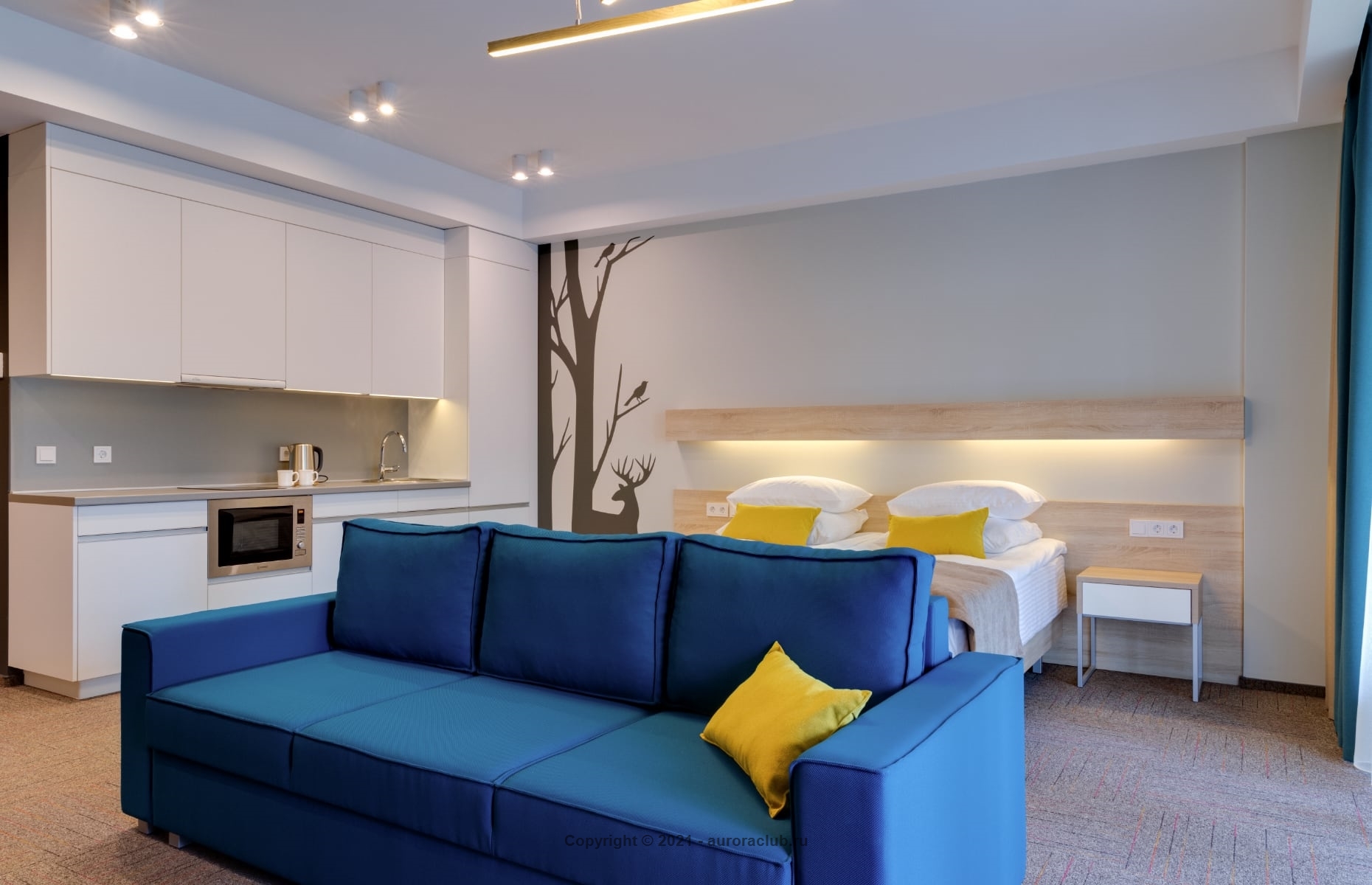 Просторный номер Studio c кухней. Имеются варианты номеров с террасой и без, с видом на озеро и лес. В стоимость включено посещение SPA - зоны и бассейна. Два спальных места: двуспальная кровать и двуспальный диван - кровать.